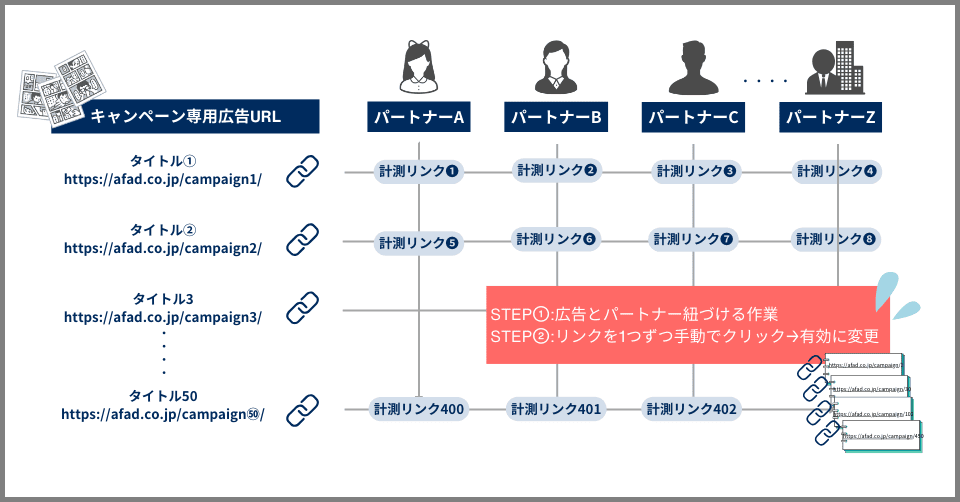 この場合、キャンペーン専用リンクと複数のパートナーを紐づけると数百個のリンクが生成されますが、
