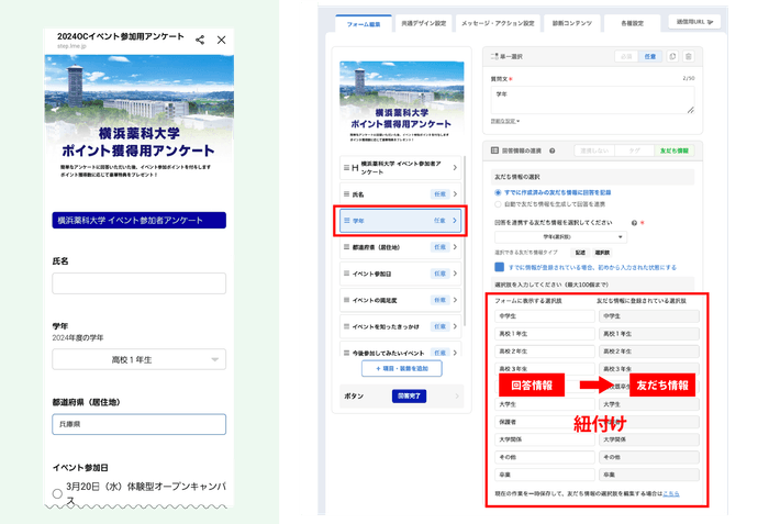 L Messageのフォーム作成機能を活用し、イベント参加者の「学年」「居住地」「参加日時」などをLINE上でスムーズに収集。