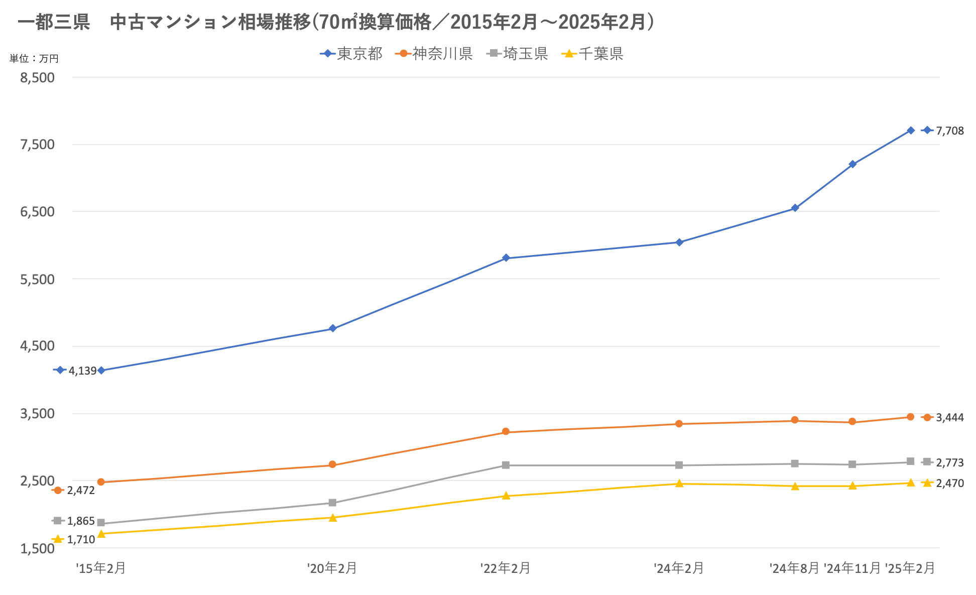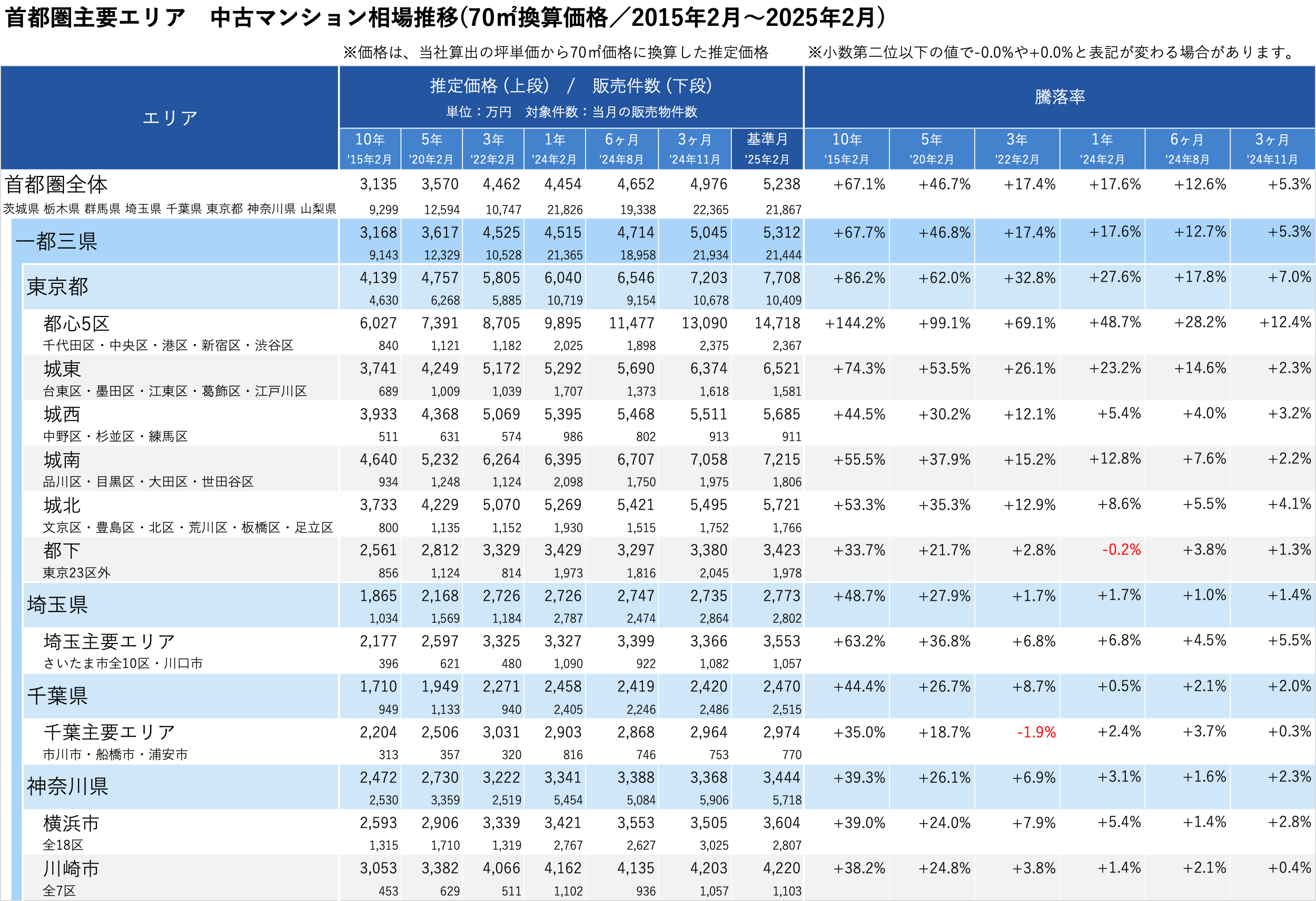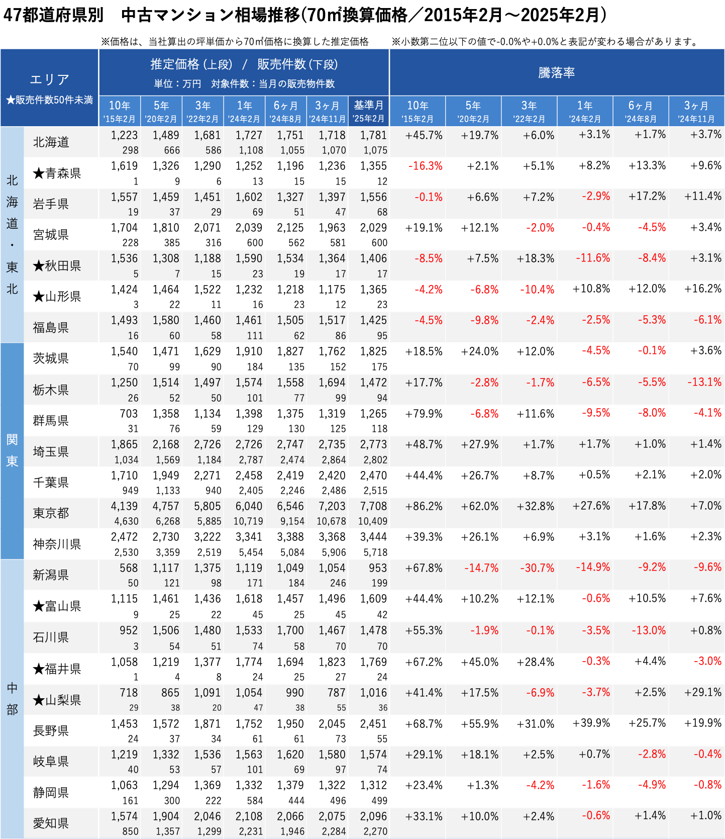 「不動産×WEB×ビッグデータ」の領域で、さまざまな不動産テックサービスを展開する株式会社ワンノブアカインド(本社:東京都港区、代表取締役社長:川島 直也、以下当社)は、当社が運営しているマンション情報サイト「マンションレビュー」の保有データを元に、全国の2025年2月の中古マンション相場を調査。坪単価をベースに70㎡での価格に換算した「中古マンション価格」*1について、10年前・5年前・3年前・前年からの推移を都道府県別・エリアごとにまとめましたので、発表いたします。