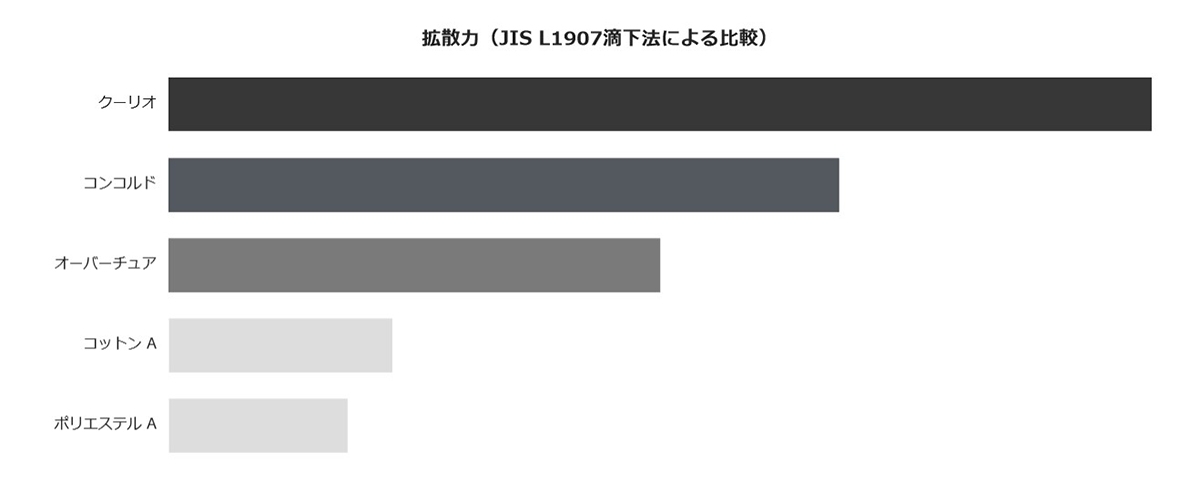 「植物系再生繊維キュプラ」×「捲縮性長繊維ポリエステル」の強撚糸1本1本が、まるで植物の茎のように優れた毛細血管現象能力をもっており、コットン以上にすばやい吸水吸汗性/発散性を発揮する水はけの良い繊維です。