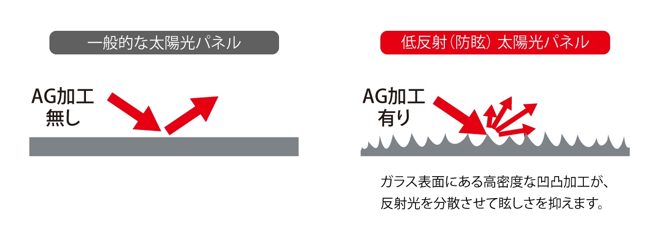 低反射(防眩)太陽光パネルは、ガラス表面のAG加工による高密度な凹凸が反射光を分散させることで、優れた低反射性能を発揮し、眩しさを抑えることができます。さらに従来の太陽光パネルだけではなく、屋根に使用される各種素材よりも光の反射が少なくなっています。