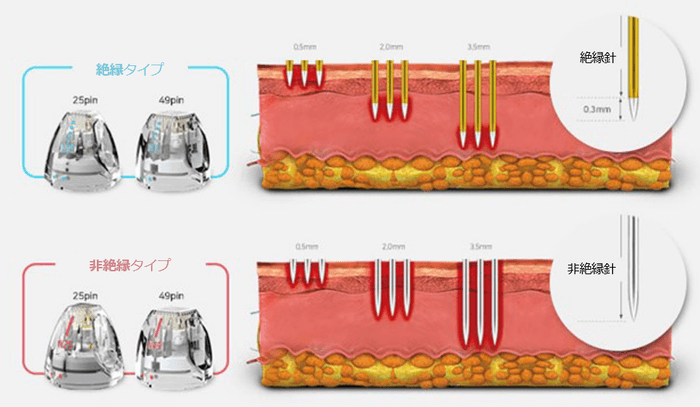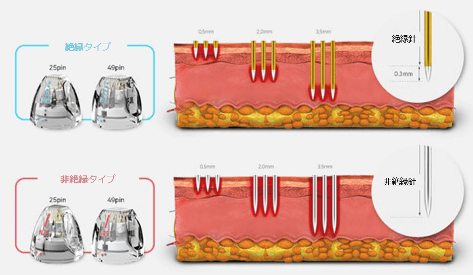絶縁針と非絶縁針の2種類があります。絶縁針は、肌の表面付近には熱が入らず、深い部分に集中してエネルギーが加わるようになっています。非絶縁針は、肌の表面から深い部分まで均一にエネルギーが加わるようになっています。治したい症状に応じて針を選択します。