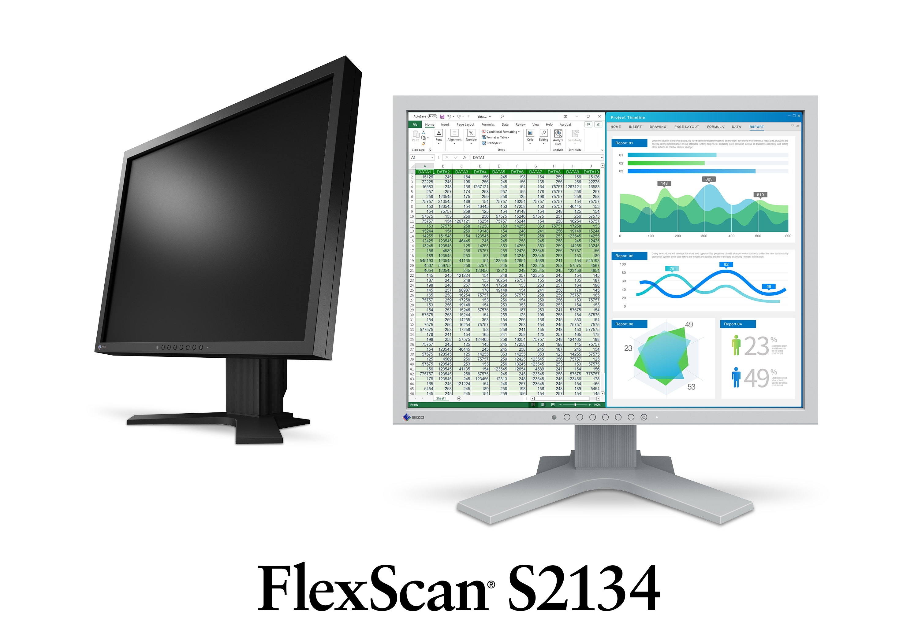 FlexScan S2134(以下 S2134)は、21.3型UXGA(1600×1200)解像度を持つスクエアモニター、FlexScan S2133-Hの後継機種です。S2134は、S2133-Hの基本性能を踏襲しつつ、より高輝度、高コントラスト比の液晶パネルを採用しており、照度の高い環境でも表示内容をしっかり確認できます。