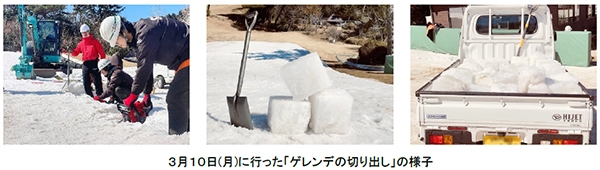 「自然体感展望台 六甲枝垂れ」では、この歴史をヒントに考え出された自然循環の仕組みの一つ「氷の切り出し」を毎年1月20日頃の「大寒の日」に行ってきました。「氷の切り出し」は、展望台東側に位置する「氷棚(ひょうだな)」で雨水を溜めて氷を作り、チェーンソーを使って切り出します。しかしながら、近年は温暖化の影響による結氷不良に加え、自然に任せた取り組みで氷ができるタイミングを予測しづらいため、早春に近隣にある六甲山スノーパークのゲレンデの雪を切り出して、展望台内部にある「氷室(ひむろ)」に貯蔵しています。
