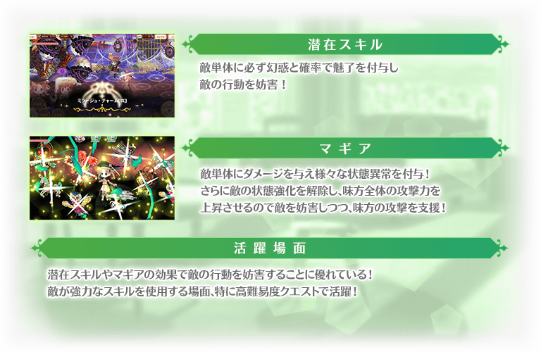 スキルで「毒」や「幻惑」といった状態異常を付与してくるため、敵のスキルを妨害する「スキル不可」や、付与された状態異常を解除、もしくは状態異常耐性をUPし状態異常を防ぐコネクトやマギアを持った木属性の魔法少女を編成、またはメモリアを装備することが有効です。