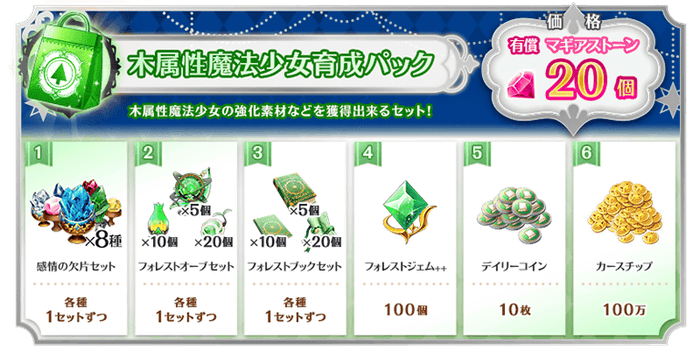 「木属性魔法少女育成パック」には、有償マギアストーンと無償マギアストーンのそれぞれで購入できるパックが2種類あります。