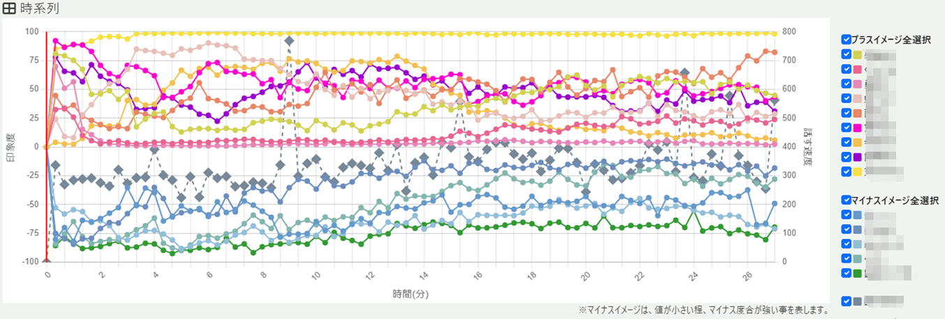 ● 動画全体のスコア化の他に、評価項目を時系列のグラフ表示で可視化するため、ユーザは動画を見ながらプレゼンテーション印象度を把握する事ができます。