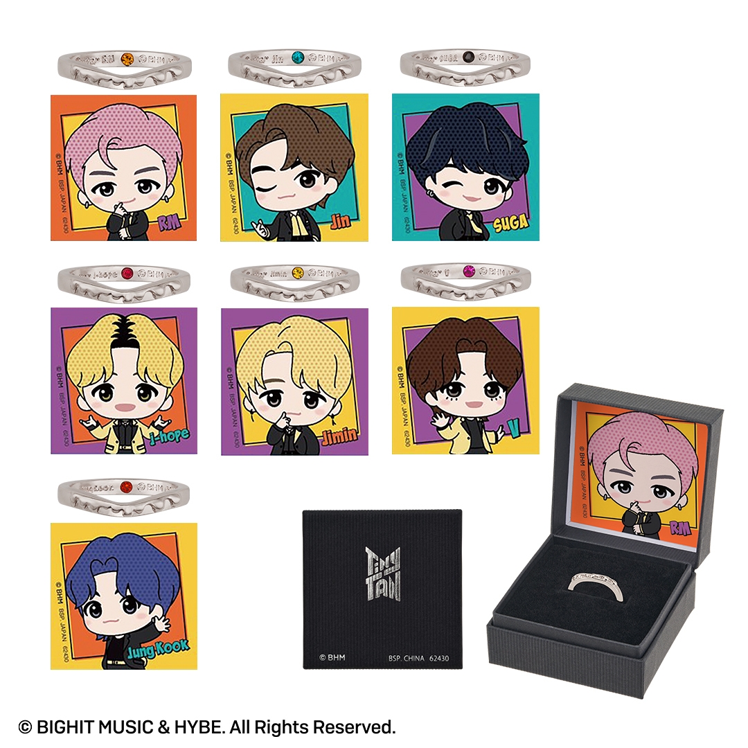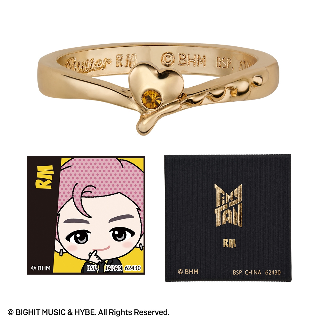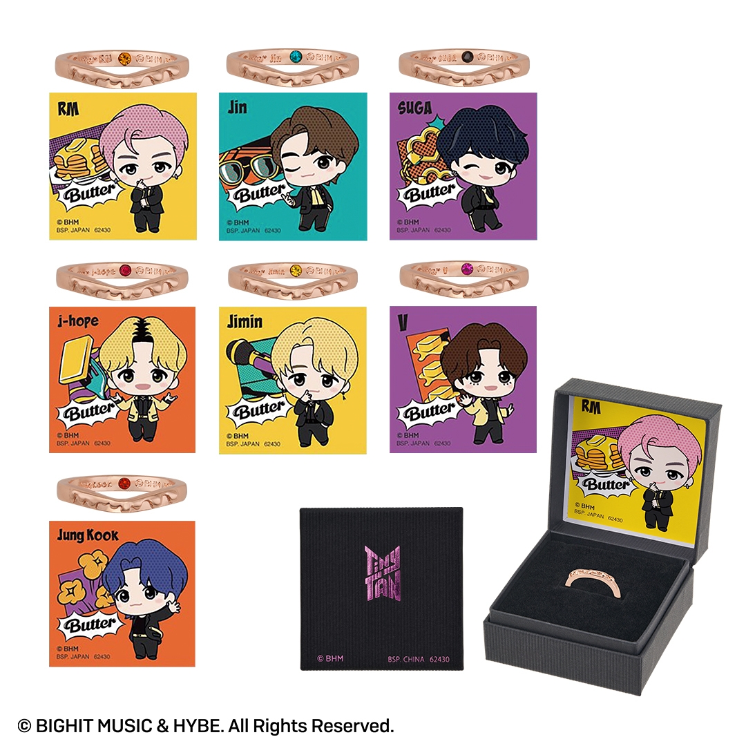 本商品は、BTSのキャラクター『TinyTAN』の一番アクセです。人気楽曲「Butter」をモチーフに、リングやチャーム付きペンダントをラインナップしました。