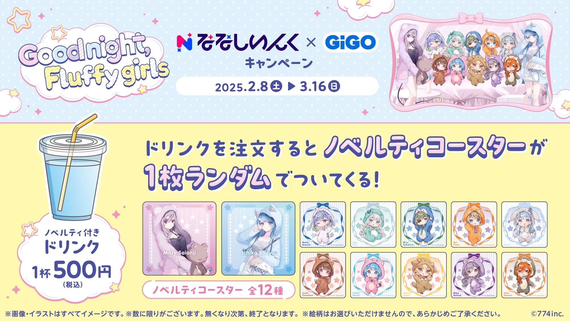 株式会社GENDA GiGO Entertainment(本社:東京都港区 代表取締役社長:二宮 一浩 以下、「当社」)は、2025年2月8日(土)よりGiGOのお店限定にて「ななしいんく×GiGOキャンペーン~Good night Fluffy girls~」を開催いたします。