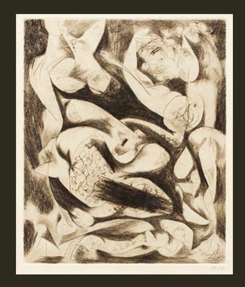 本作は1944年に実験的に制作された11の版画の一つが元になっており、抽象とも具象とも見えるイメージや、その後アクションペインティングの布石となるオートマティスム(自動筆記)への興味が垣間見える作品です。