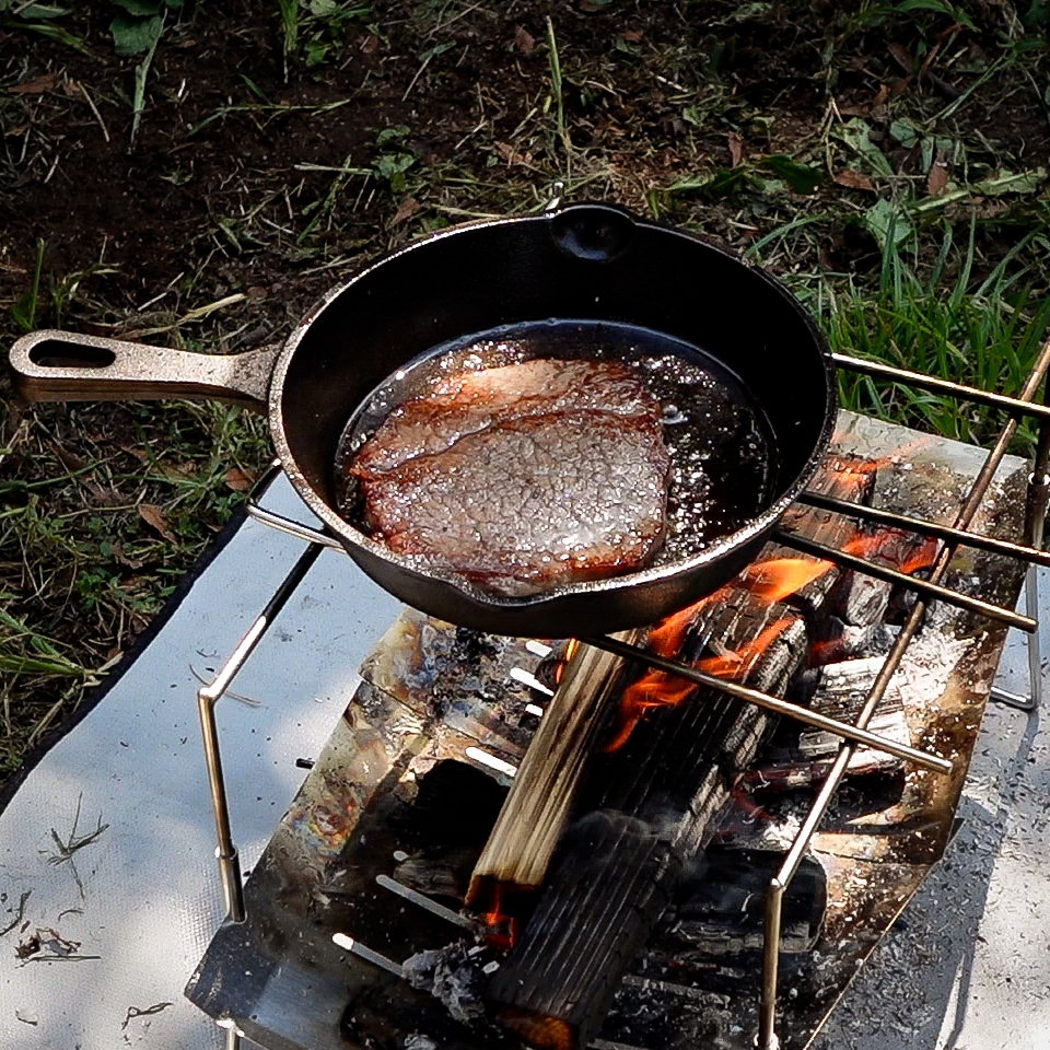 ソロキャンプやデュオキャンプでの調理に最適なミニサイズのフライパン。注ぎ口が両サイドについて利き手関係なく水分が切れます。調理中に溶け出した分で少しずつ鉄分補給ができる優れもの。素材特有の厚みがあり、熱をじっくり均等に伝えてくれます。