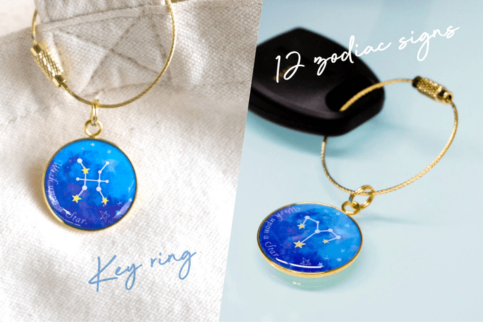 夜空の星座がゴールドカラーの台座に映える華やかで上品なキーリング。 ねじ式タイプなので、家や車のキー・バッグやポーチなどに簡単に付けられます。 贈る相手の星座をえらべば、ちょっとした特別感を感じてもらえるのではないでしょうか。さまざまな年代の方に喜んでいただけるように、高級感とおしゃれ感を兼ね添えた上品なデザインに仕上げました。