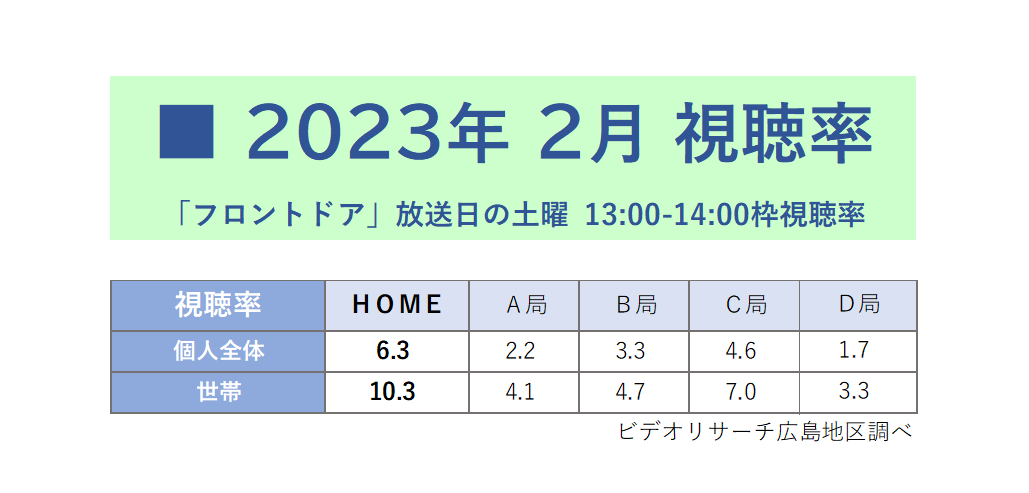 2023年2月の月間平均個人全体視聴率6.3%、世帯視聴率10.3%を記録し、同時間帯でいずれも1位(ビデオリサーチ調べ、広島地区)を獲得しています。