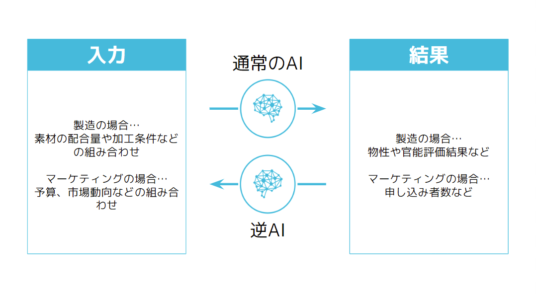 この逆AIを用いることにより、例えば、製造業における研究開発の工数を大幅に削減し、効率的な新製品の開発を行うことが可能となります。また、製造業以外の業種においても、予算や計画の策定など、特定の条件下で最適な設定を見つけたいという場合において、活用することができます。