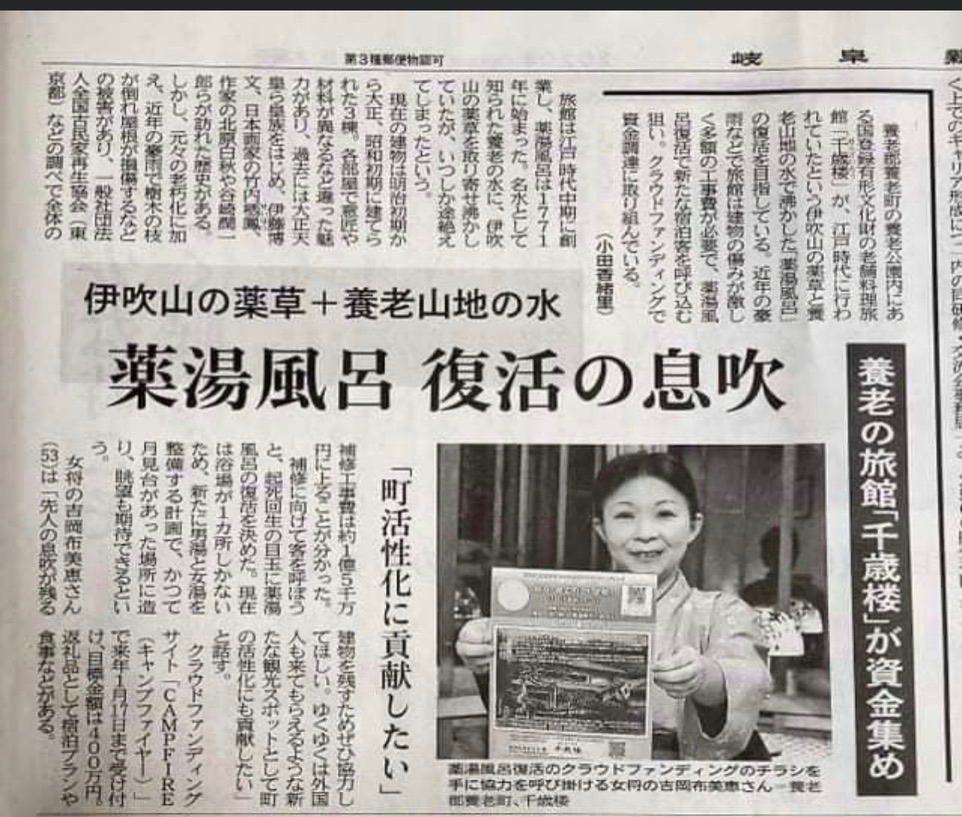 サクセスまでのラストスパート“文化人ゆかりの宿「千歳楼」” #クラウドファンディング 江戸時代に行われていた伊吹山の薬草と養老山地の水で沸かした【薬湯風呂再現プロジェクト】は2021/01/17まで!