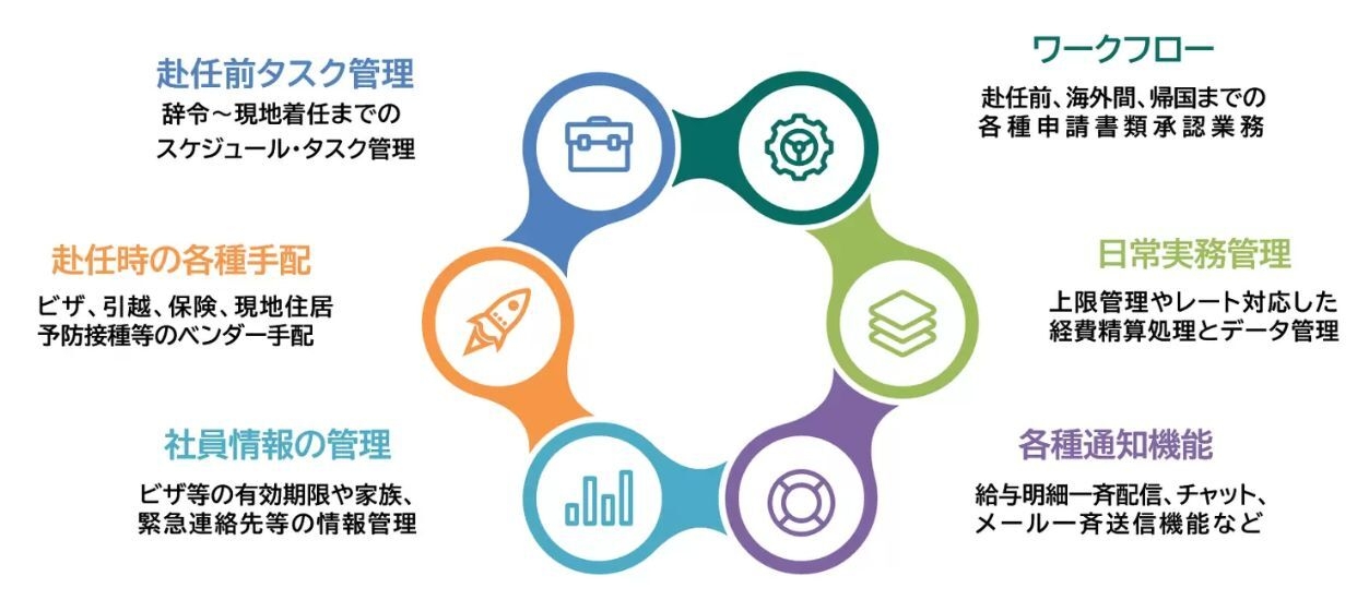 赴任時に必要なベンダー手配をはじめ、赴任者用の各種申請書など、海外人事業務に必要な機能が集約されているため、本システムで一元管理が可能です。