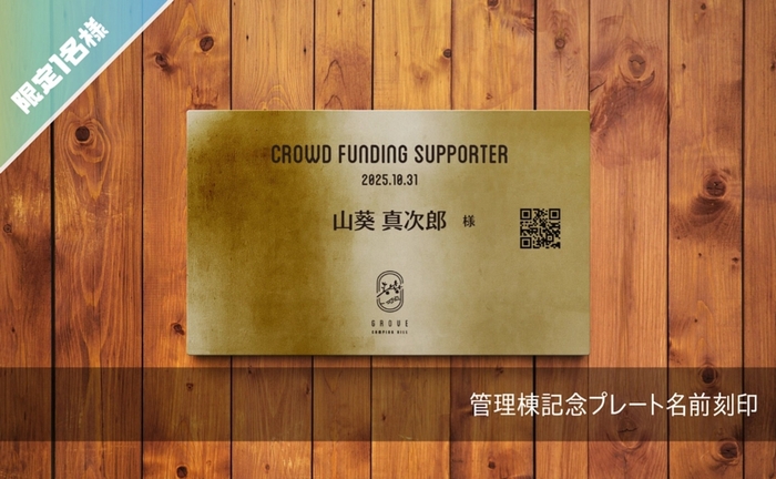管理棟の定礎プレートやキャンプ場のメイン看板に、支援者様のお名前を特別に刻む権利を1名様限定でご提供します。
