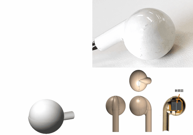 従来のカナル型イヤホンと違い、空気を揺るがすほど振るわせなくてもいい。骨伝導と違い、硬い骨に強い音波の振動を伝えなくてもいい。 耳のくぼみを形どっている軟骨に振動を伝えればいいので、小さく丸い振動体のほうが接触面積が広くなるというメリットがあります。