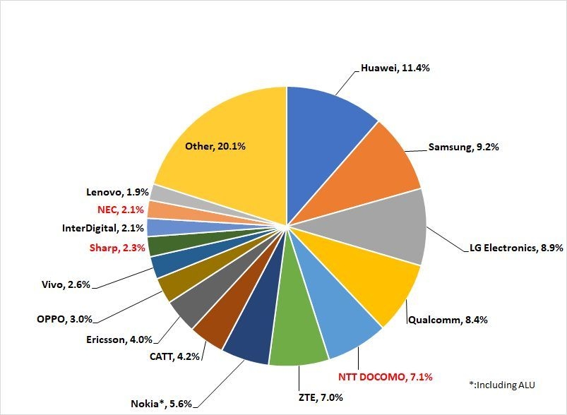 日本企業では、10位以内はNTT DOCOMOだけで、5位です。15位以内では、Sharp、NECが入っています。
