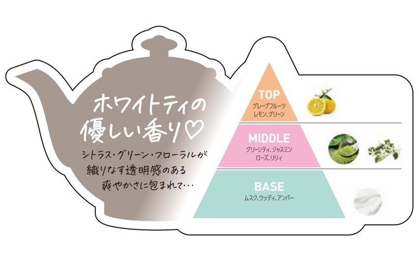 ・人気のホワイトティの香り。爽やかさに包まれて、透明感も感じられる。心が落ち着くシトラス・グリーン・フローラルが織りなす優しい香り。