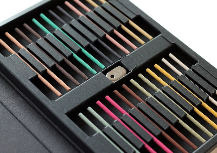 「すべすべ」、「もちもち」、「とげとげ」、「ぱちぱち」などの触感を香りで表現したインセンスは全て7cmのスティックタイプ。12種類が2本ずつセットされていて、メタル製のホルダーが付属します。
