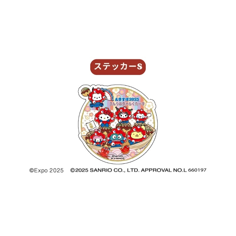 ハローキティ、マイメロディ、シナモロール、クロミ、ポムポムプリン、ポチャッコ、ハンギョドンが公式キャラクター「ミャクミャク」になりきった姿もとってもキュート。大阪名物・たこ焼きの舟に、みんなが大集合!お土産や思い出の品として自分用にもぴったりです。