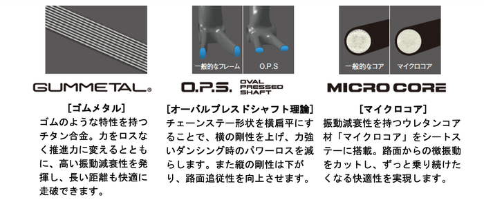 フレームには、素材を軽量化しても強度を保てる、ゴムのような弾性と復元性に優れたチタン合金「ゴムメタル」を採用。力をロスなく推進力に変えるとともに、高い振動減衰性を発揮し、快適性を向上させます。