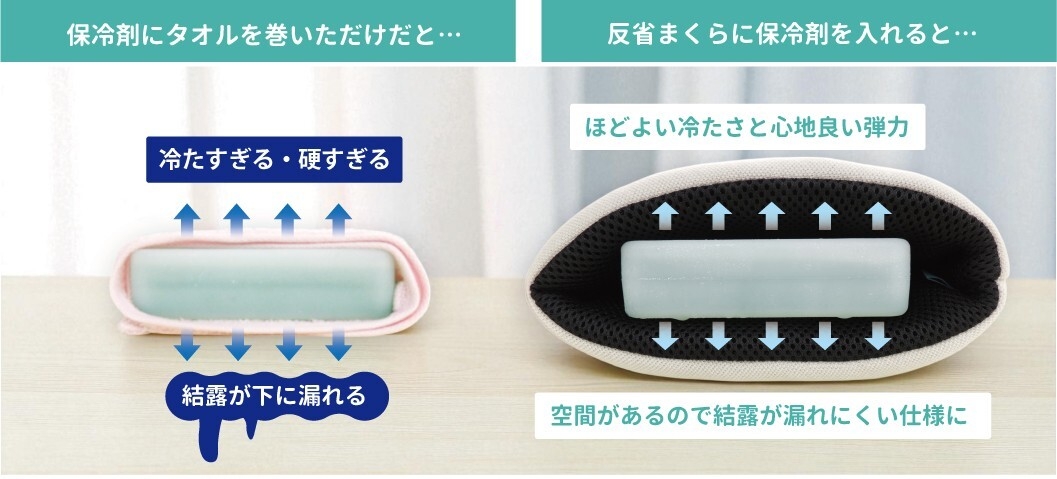 そこで、「快適な弾力、やさしい冷たさが長持ち、ムレず、寝具が濡れない」を兼ね備えた新しいまくら「反省まくら」の開発に至りました。ちなみに、タオルを入れて好みの高さに調整することもできます。