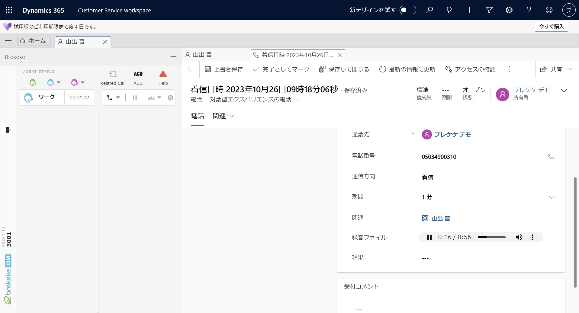 ・通話録音を含めた履歴が自動的に「Dynamics 365 Customer Service」のカスタマーワークスペースに記録されます。