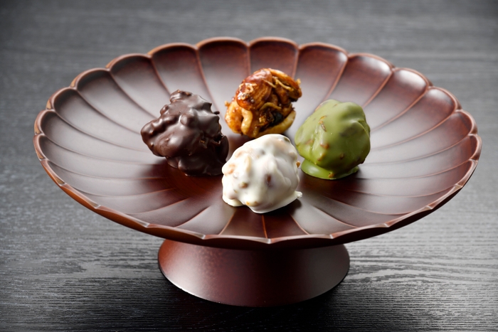 発売以来、年齢性別を問わず愛される「料亭のちりめんナッツ」にビターチョコ、ホワイトチョコ、抹茶チョコがコーティングされた「料亭のちりめんナッツ - 玉響 -」を数量限定販売。伝統と革新にこめられた「料亭のちりめんナッツ」と宇治抹茶を使用した抹茶チョコなど、贅沢な味わいをお愉しみいただける京都らしい和のショコラ。
