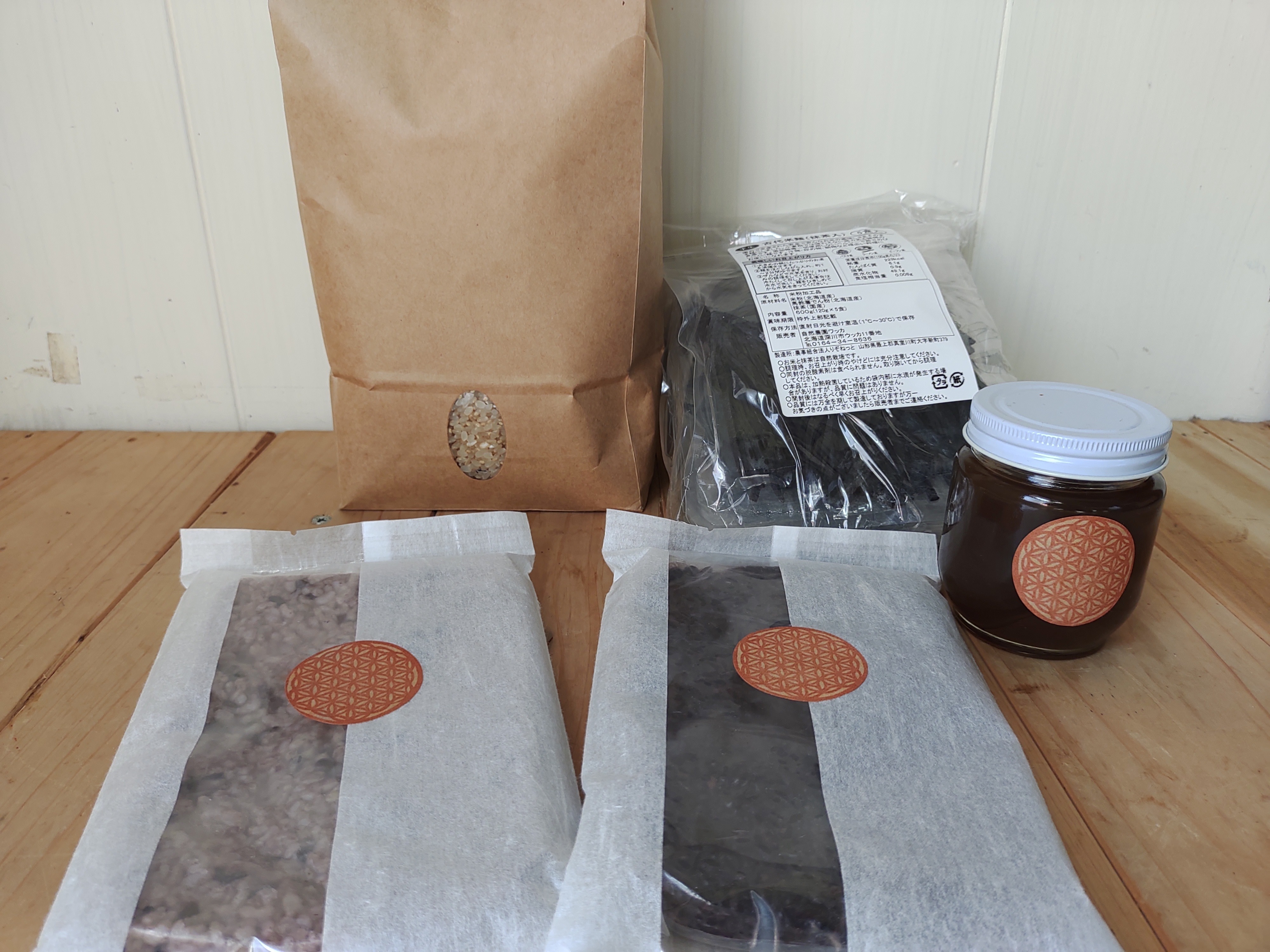 50,000円:自然栽培米5kg・レトルトご飯200g×4・古代米麺5食×2・黒米飴
