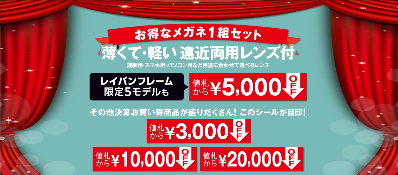 主なキャンペーン内容:メガネ1組¥3,000 OFF ~ ¥50,000 OFF、レイバン1組¥5,000 OFF