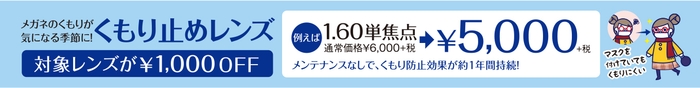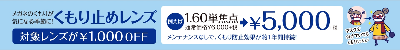 くもり止め機能付き対象レンズが1,000円OFF!マスクの装用や寒暖差でメガネのくもりが気になるこの季節、くもり止めレンズで快適な毎日を!