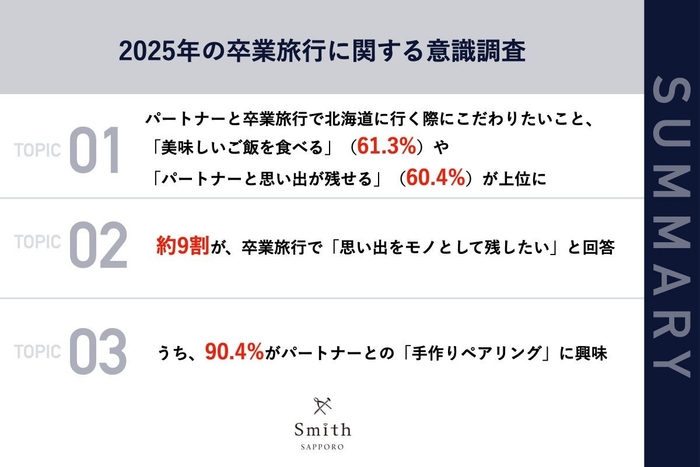 株式会社 一宝(本社:北海道札幌市、代表取締役:懸谷 正人)が運営する、手作り結婚指輪・婚約指輪・ペアリング専門店「工房Smith札幌」は、パートナーと卒業旅行で北海道に行く予定がある学生106名を対象に、2025年の卒業旅行に関する意識調査を実施しましたので、お知らせいたします。