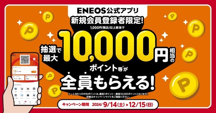 当社(社長:山口 敦治)は、9月14日(土)から12月15日(日)までの間、ENEOSのサービスステーション(以下、「SS」)において、ENEOS公式アプリを新規に会員登録いただき、給油いただいたお客様を対象に、ENEOS公式アプリ新規会員登録者限定!「抽選で最大10,000円相当のポイント等が全員もらえる!キャンペーン」※1(以下、「本企画」)を実施しますので、お知らせいたします。