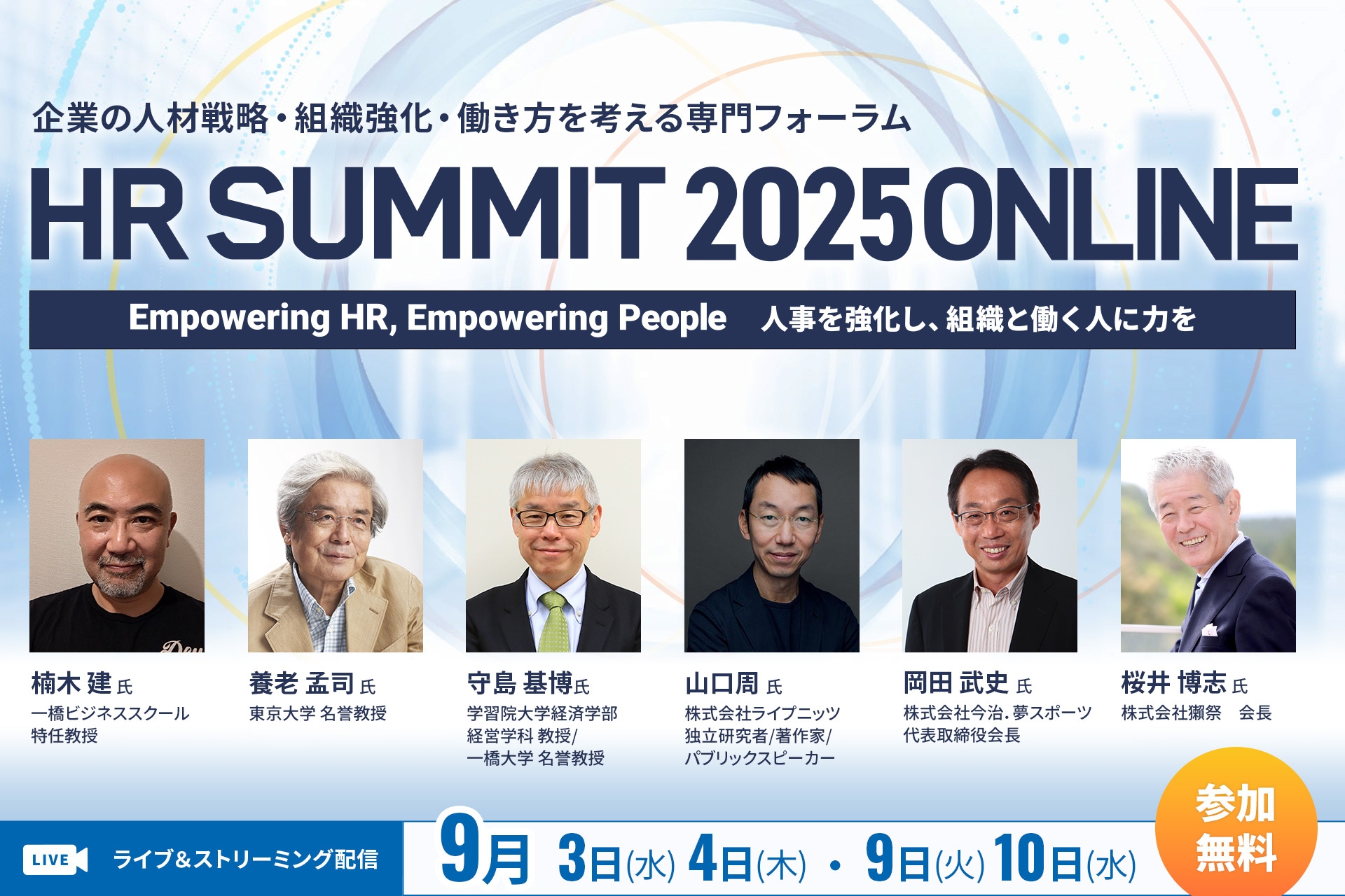 9/3から開催「HRサミット2025 ONLINE」申込受付を開始 養老 孟司 氏、岡田 武史 氏、山口 周 氏、楠木 建 氏ら 豪華ゲストが多数ご登壇