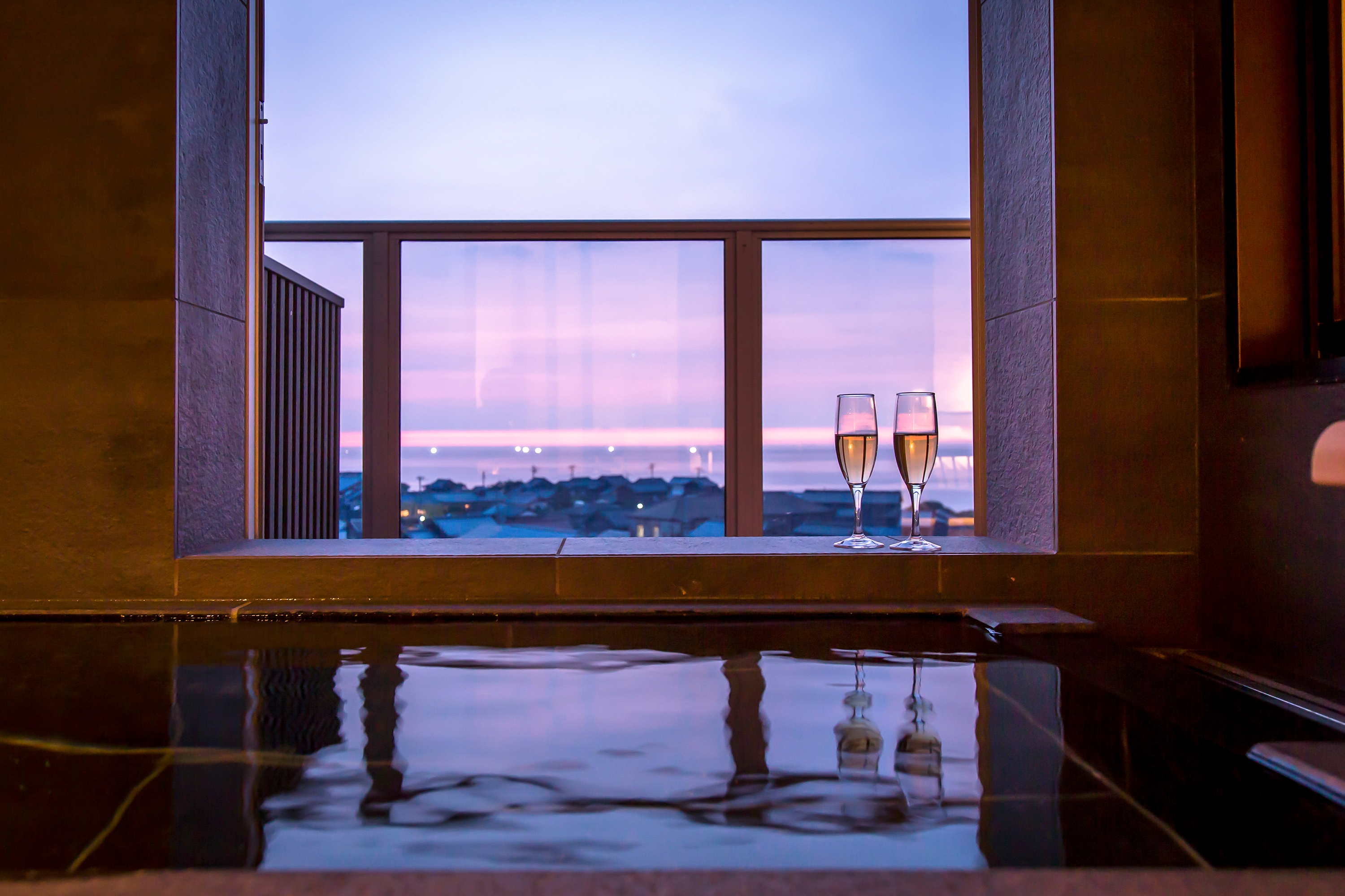 大人のための上質な時を刻む「佳松苑 別邸ふうか」は、ワンフロア3室・全18室の温泉展望風呂付き客室からなる大人宿。海と夕日の「ラウンジテラス碧-AO-」や、演出と旬食材が彩る豊かな「創作料理」でゲストの旅を彩ります。