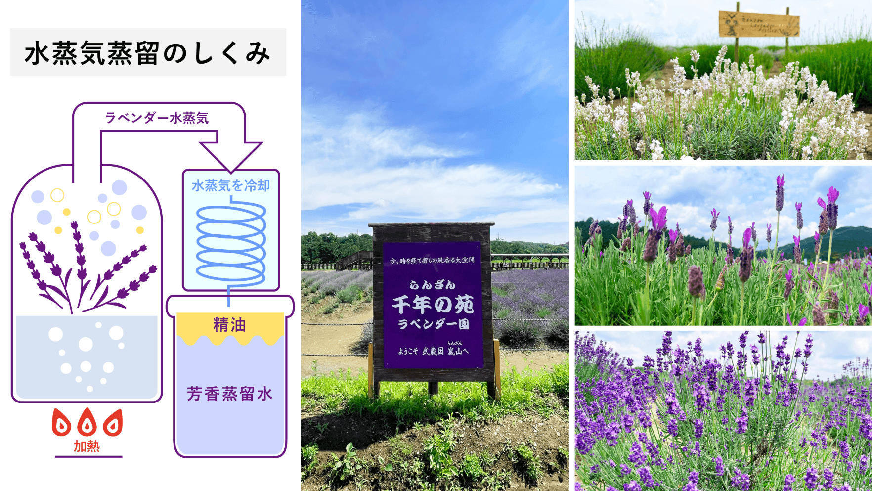 香り成分の精油を花や葉から採取する際、蒸留工程で副産物の「芳香蒸留水」という香りの良い水が大量に生まれます。東京ドーム約1個分の広さのラベンダー園がある埼玉県嵐山町では、精油を使った商品展開は多いものの、芳香蒸留水の「ラベンダー水」約数百キロは活用しきれておらず廃棄されていました。