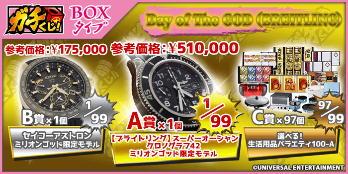 尚、販売当日5月10日(月)の20時からは、ナビゲーターのアナクロニスティック(人力舎)が、『ガチくじ!チャンネル』(https://www.youtube.com/c/gachikuji)の生配信を実施。今回の新くじは、生配信と同時に発売開始となります!特に『ブライトリング スーパーオーシャン クロノグラフ 42』はボックスタイプでの販売(確率1/77)、生配信時間内に販売締切を迎える、というまさに「ガチ」な激熱展開となっております。