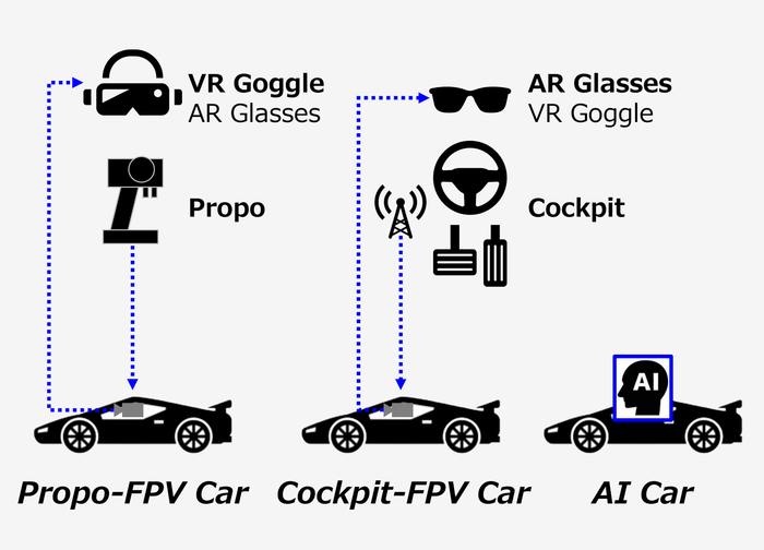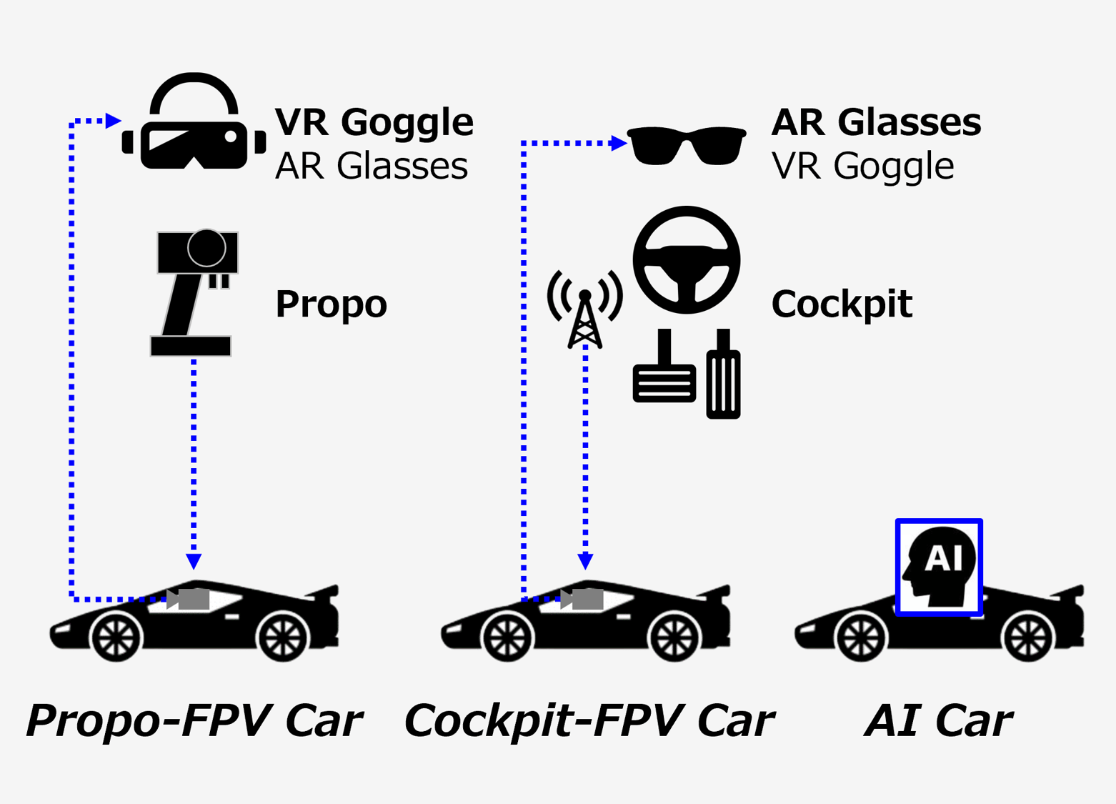 ●Cockpit-FPV:車載カメラ映像をARグラスで見ながら、コックピットに座りステアリング&ペダルで遠隔操作