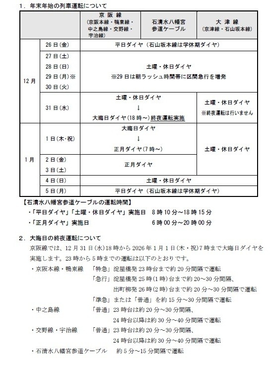 京阪電気鉄道株式会社(本社:大阪市中央区、社長:井上 欣也)では、京阪線と石清水八幡宮参道ケーブルにおいて、大晦日の終夜運転を実施します。また、元日から1月3日(土)にかけて初詣や初春のお出かけに便利な正月ダイヤで列車を運転します。