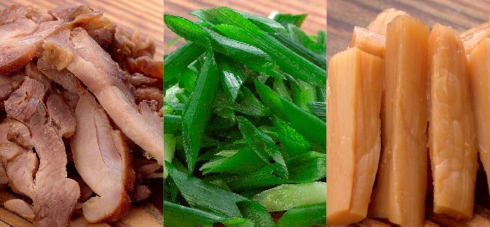 秘伝の醤油ダレで煮込まれたかしわ(鶏チャーシュー)、斜めに切った青ネギ、メンマは、笠岡ラーメンの正統派スタイルです。