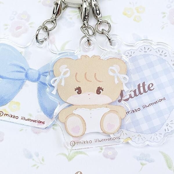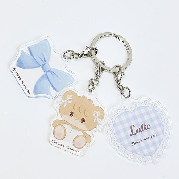 続いては子くまのラテの3連アクリルキーホルダーです。爽やかなパステルブルーで、心が穏やかになりそう。