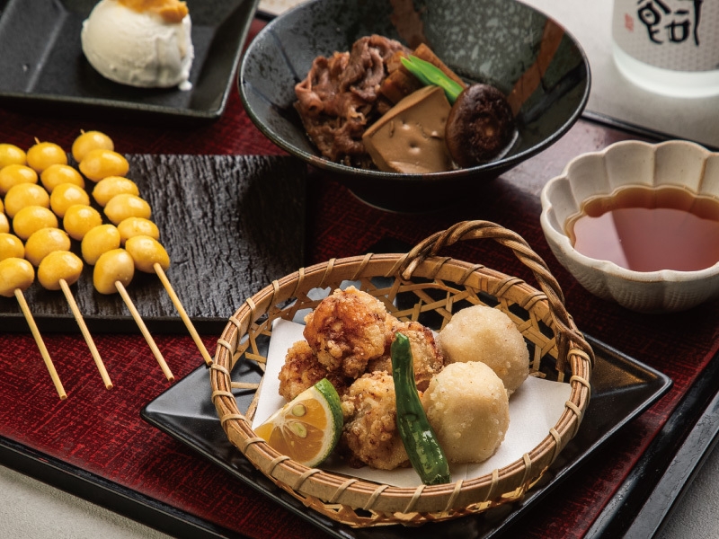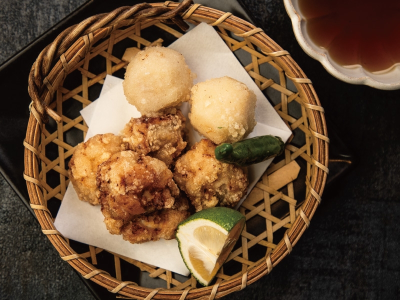 北海道産の上品な甘みの真フグとホクホク里芋を唐揚げに仕立て、かぼすの爽やかな香りを添えました。