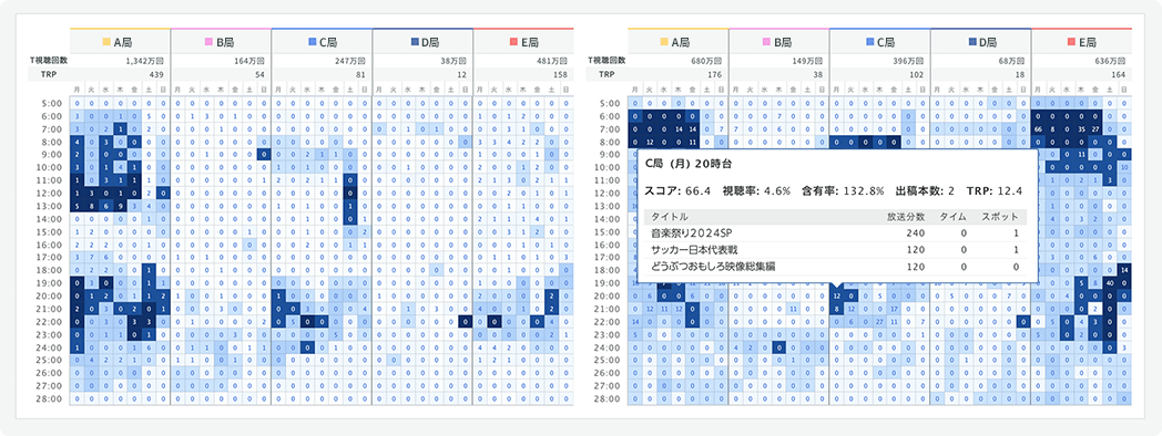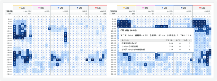 局別、曜日・時間帯別の各枠の評価指標として、ターゲット視聴率だけでなく、ターゲット含有率、視聴率と含有率を考慮した独自のターゲットスコアという3つの指標を切り替えて表示できます。各枠に表示される数値は、出稿本数、ターゲット視聴率、ターゲット含有率から選択可能です。さらに、マウスオーバーされた枠の番組名やタイム/スポット別のCM出稿本数が表示されるようになりました。2つのヒートマップを横並びで比較できるため、競合商品の出稿状況やターゲット属性による数値の違いを簡単に比較できます。
