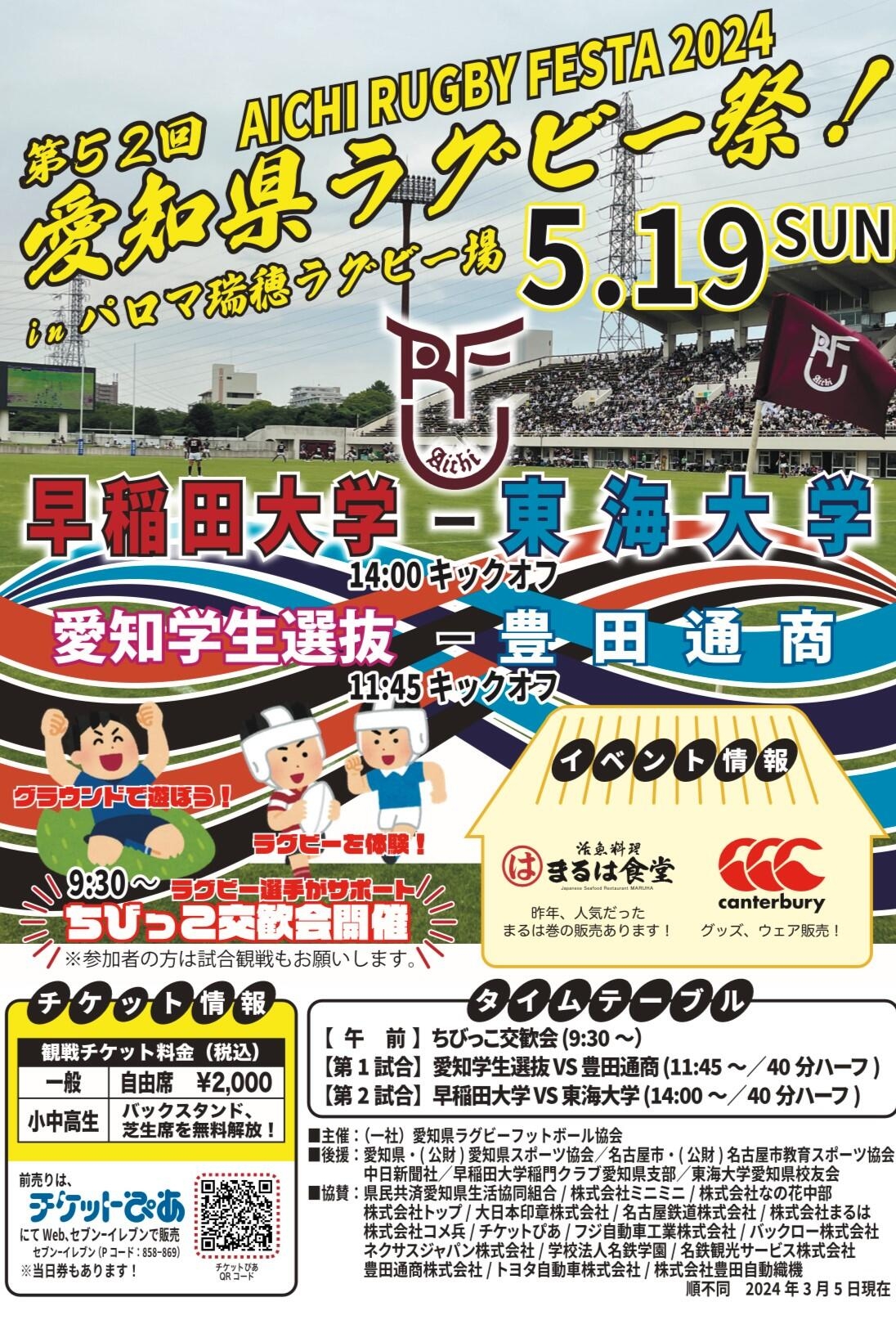 第52回愛知県ラグビー祭が5月19日(日)、名古屋市瑞穂区のパロマ瑞穂ラグビー場で開催され、11:45キックオフの「 愛知学生選抜VS豊田通商 BLUE WING」の愛知学生選抜のメンバーに本学ラグビー部から下記5名が選出されました。学生VS社会人の熱い戦いが期待されます。ぜひ、会場での応援をよろしくお願いします。
