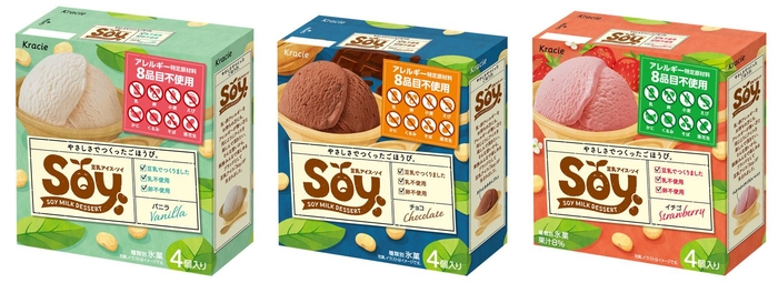 「Soy バニラ」は、豆乳を使用しながらも生クリームのような香りとコクのある濃厚な味わいを実現し、豆乳特有のクセを抑え、なめらかな口どけに仕上げました。「Soy チョコ」は、ミルクチョコをイメージしたまろやかな甘さと、カカオニブのツブツブとした食感がアクセントになっています。「Soy イチゴ」は、イチゴ果汁を使用し、口に入れた瞬間に広がる甘酸っぱい香りとやさしい味わいが特長です。