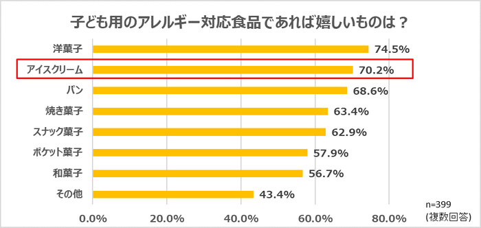 アレルギーを保持する子どもがいる親339名に対して、アレルギー対応食品であれば嬉しいものを尋ねたところ、74.5%が「洋菓子」と回答し、2番目に多かった回答が「アイスクリーム」(70.2%)でした。以下、「パン」(68.6%)、「焼き菓子」(63.4%)、「スナック菓子」(62.9%)と続きました。