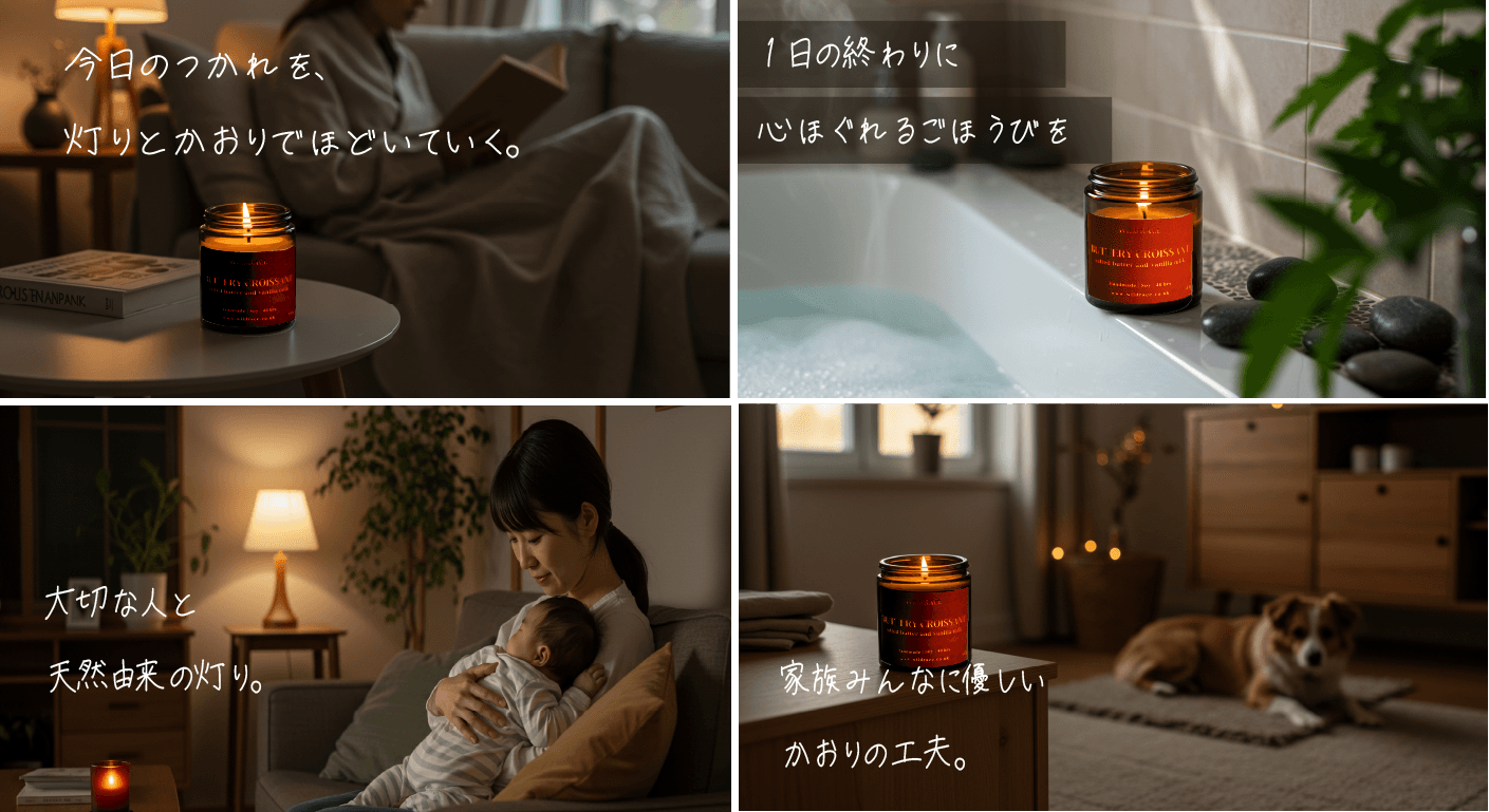 このキャンドルの魅力は、何といっても「香りのストーリー性」にあります。たとえば「焼きたてのバタークロワッサン」の香りは、まるで朝のカフェにいるような温かさと安らぎを運んでくれます。