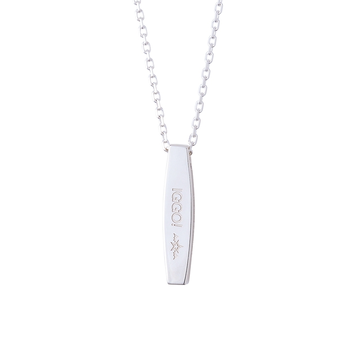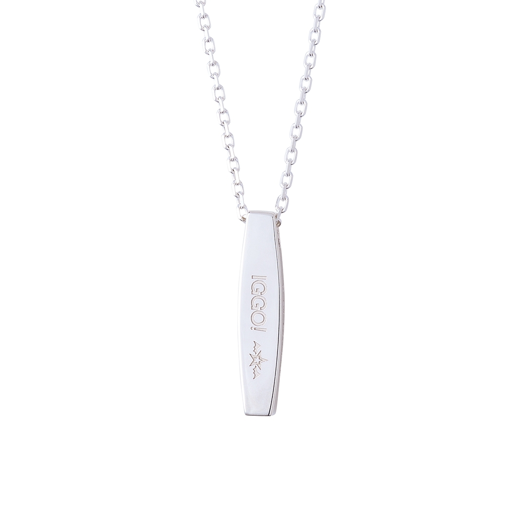 バータイプのトップの表面には、ドレッシングパフェのチームロゴから模様を取り込み3石のカラーストーンをセット。裏面にはシオンの口癖、「IGGO!」の刻印を施しました。